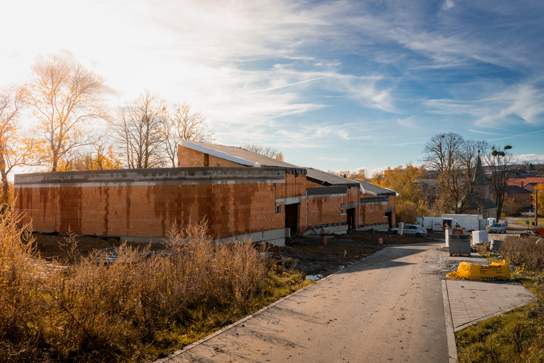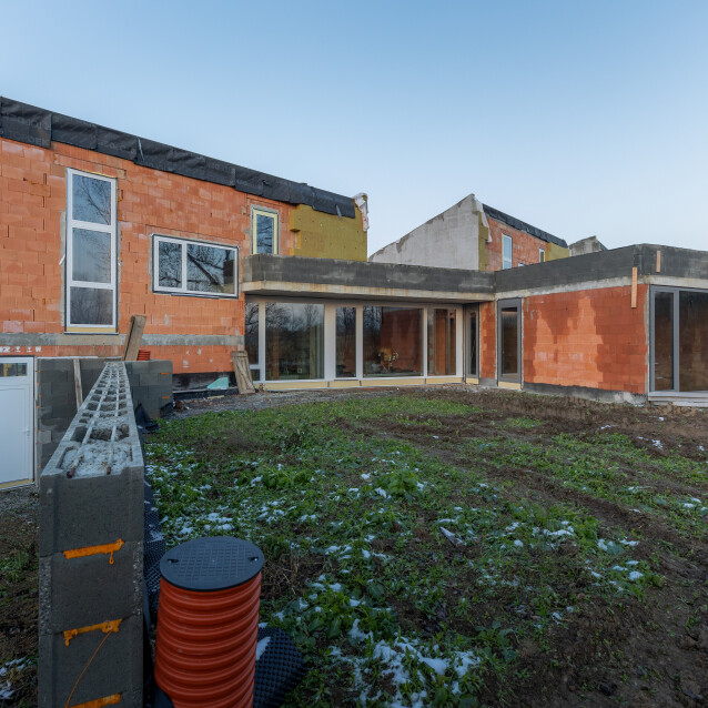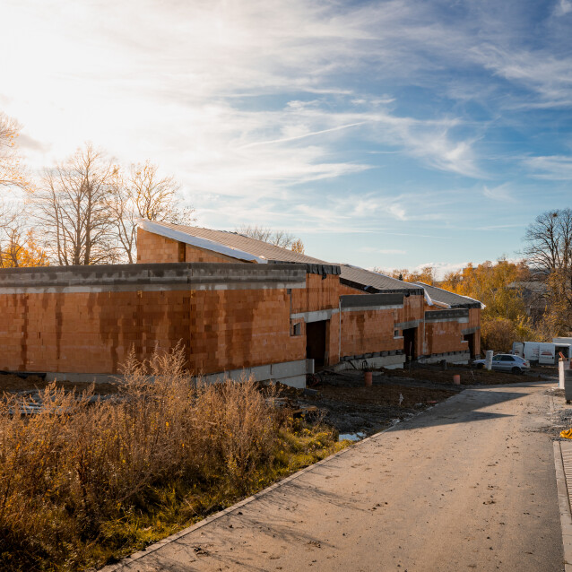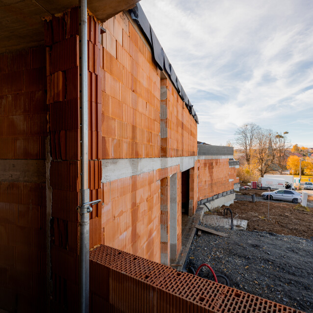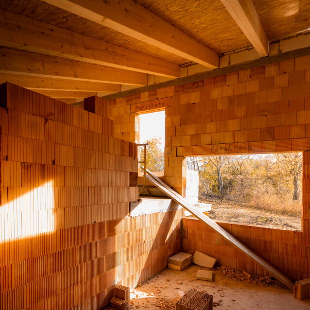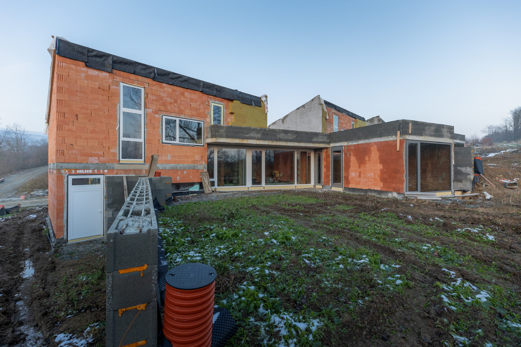 Obvodové a vnitřní příčky jsou vyzděny z přesných cihel Porotherm, doplněných o akustické zdivo Porotherm AKU.