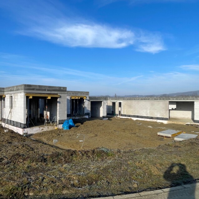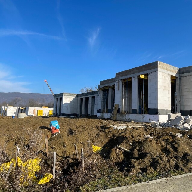 Práce nyní spočívají především v přípravě základových konstrukcí a modelování terénu tak, aby stavba respektovala přirozený charakter svažitého pozemku.