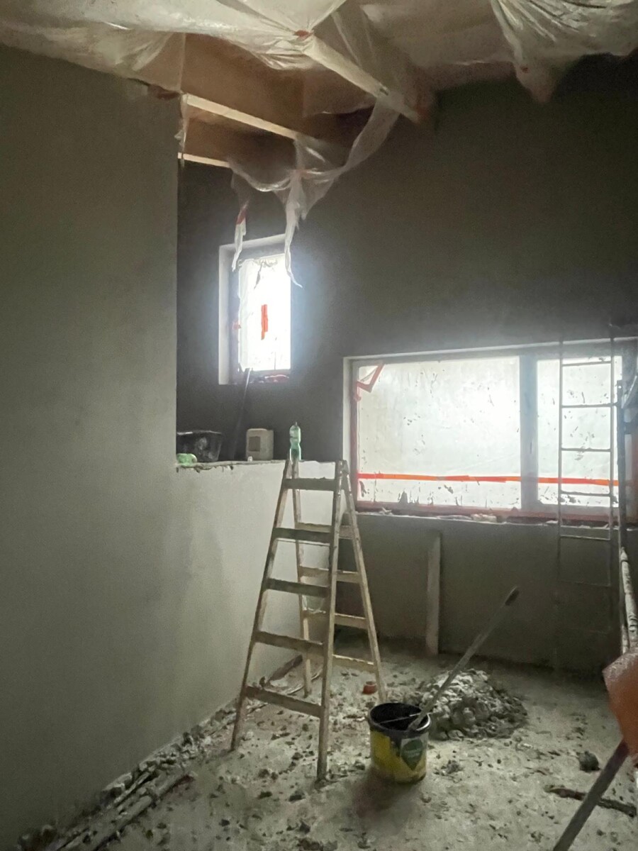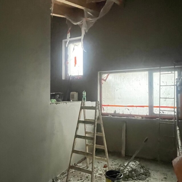 Uvnitř rodinných vilek aktuálně probíhají vnitřní omítky, díky kterým už začínají být jasně čitelné jednotlivé místnosti a celková atmosféra budoucího domova..